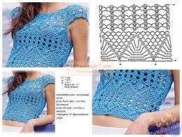 Топ вязаный крючком Размер: 42/44 Вам потребуется 250 г голубой пряжи (100% мерсеризованного хлопка, 475 м/50 г). 2 катушки люрекса. 15 серебристых бусин диамет...