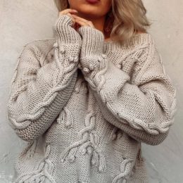 Этот свитер выполнен с использованием сложной техники объемной вязки, включающей крупные косы и фактурные элементы, создавая уникальный рельефный рисунок на пер...