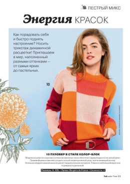 Уникальное сочетание больших цветных квадратов в технике интарсия придает пуловеру динамичность и современность, а мягкий воротник и планки, подчеркнутые резинк...