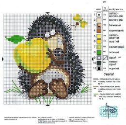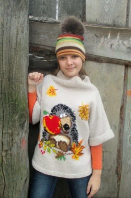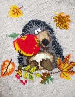 Теплый свитер спицами с объемным рисунком ежика, держащего яркое красное яблоко, украшен вышивкой осенних листьев и ягод. Модель выполнена из мягкой пряжи светл...