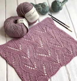 Узор выполнен в виде зигзагов, создающих интересный визуальный эффект. Пряжа нежного сиреневого оттенка добавляет изделию элегантности и мягкости. Узор спицами