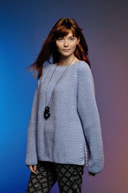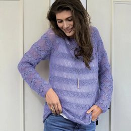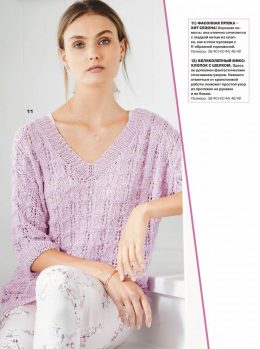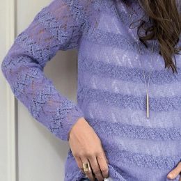 Нежный лавандовый свитер выполнен из мягкой пряжи с выразительными ажурными узорами на манжетах и по низу изделия, создавая легкость и изящность в образе. Объем...