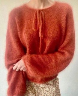 Этот нежно-зеленый пуловер с асимметричным бантом и изящными вырезами на рукавах напоминает о тех беззаботных днях, когда мы впервые учились вязать на бабушкино...