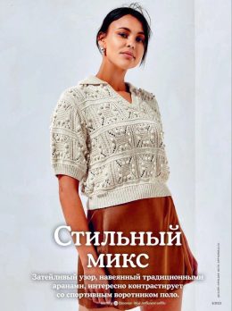 Этот изысканный вязаный пуловер с узором, вдохновленным традиционными аранами, привлекает внимание своим спортивным воротником-поло. Нежный бежевый цвет и замыс...