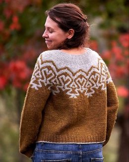 Этот уютный вязаный свитер спицами окрасит ваш день в оттенки золотой осени. Свободный фасон и изящные узоры на рукавах придают ему особый шарм, а теплый горчич...