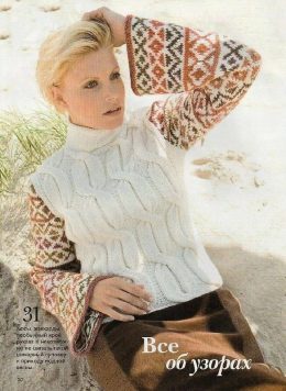 Спицами связанный пуловер с широкими рукавами, сочетающий в себе классический белый цвет и яркие этнические узоры. Этот стильный предмет одежды идеально подчерк...