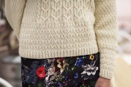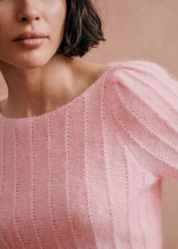 Особенность модели — мягкий воротник-стойка и аккуратные рукава с тонкими ребристыми вставками, подчеркивающими линию плеч. Использование экологичных пряж с доб...