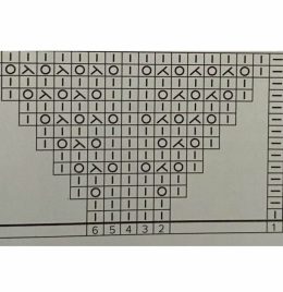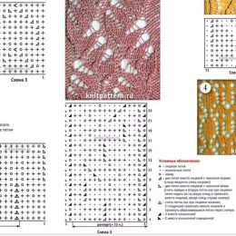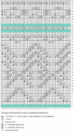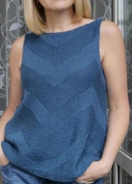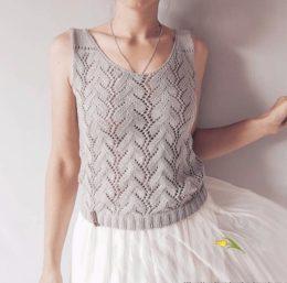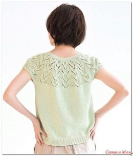 Красивый топ спицами с рисунком на передней части изделия. Основной узор: ширина 13 п. 1-й (лиц.) ряд: 1 изн., 5 лиц., 4 накида, 1 протяжка (снять 1 п., 1 лиц.,...
