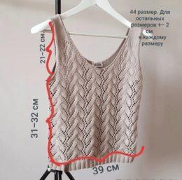 Топ вязаный спицами Размеры: 36/38 (40/42) Отличающиеся данные для размера 40/42 приведены в скобках. Если указано одно число, то оно относится к обоим р...