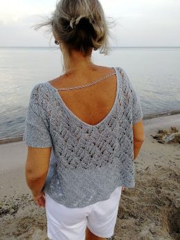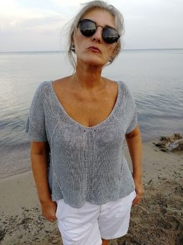 Топ с V образным вырезом. Размер :42-46 Потребуется : 200г пряжа Sandnes Garn LINE (53%хлопок, 33% вискоза, 14%лен) Спицы :4.0 Плотность вязания :10×10см, 19 п....