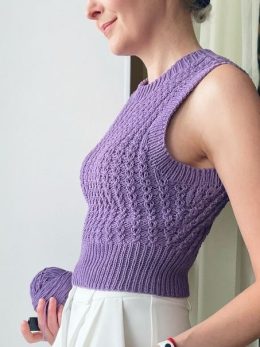 Лиловый топ вязаный спицами представляет собой стильную модель на каждый день. Ажурные узоры состоят из изящных кружевных рисунков, расположенных по вертикальны...