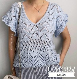Прекрасный вязаный топ ручной работы. Мягкий голубой цвет и изысканный узор придают этому изделию неповторимое очарование, делая его идеальным выбором для любог...