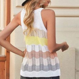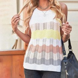 Очаровательный вязаный топ ручной работы, выполненный из натуральной хлопковой пряжи. Белые и пастельные полоски создают легкий и воздушный дизайн, который идеа...