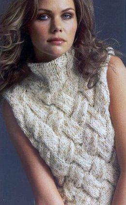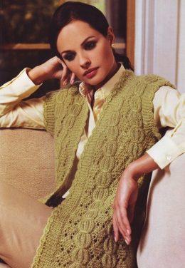 Интересный узор этой вязаной безрукавки завораживает, хлопковая нитка хорошо подайдет для данной модели спицами