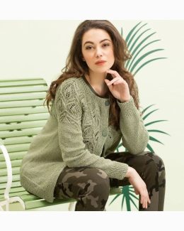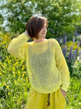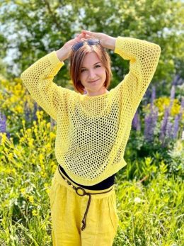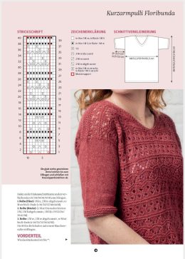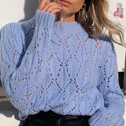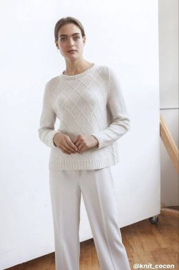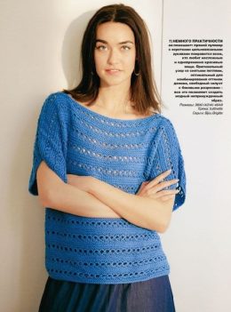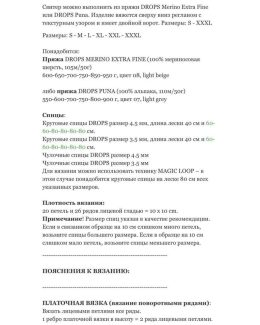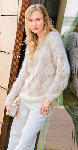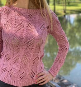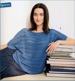 Спицами выполнен легкий пуловер с изящным ажурным узором, который придает изделию воздушность и изящество. Рукава 3/4 и свободный силуэт обеспечивают комфорт и...