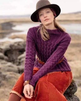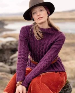 Очаровательный образ с уютным пуловером насыщенного фиолетового цвета, выполненным из мягкой пряжи с объемной косой вязкой. Уникальная структура узора придает и...