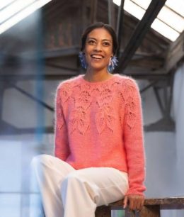 Этот свитер из мохера — настоящий праздник для глаз! Уникальный ажурный узор в виде листьев придает изделию легкость и изящество, а насыщенный коралловый цвет д...