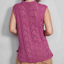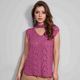 Этот топ, связанный спицами, выделяется своим изящным ажурным узором с треугольными мотивами и стильным воротником-чокером, который придает модели современный и...