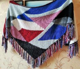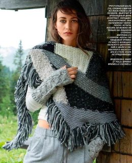 Объемная треугольная шаль, выполненная из плотных кусочков разной вязки, украшена длинной бахромой, создающей эффект мини-пончо. В прохладный день она согреет и...