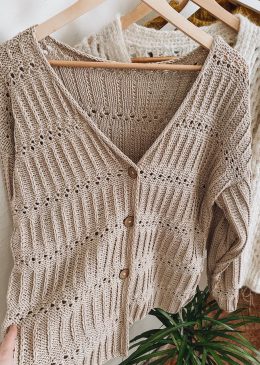 Незаметные отверстия в узоре создают эффект легкости и воздушности, а деревянные пуговицы придают изделию натуральный и уютный вид. Особенность модели — сочетан...
