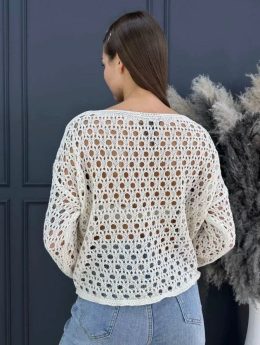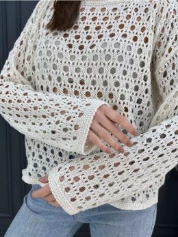 Этот легкий пуловер выполнен спицами с использованием оригинального ажурного узора, создающего эффект сетки с крупными отверстиями. Особое внимание уделено рука...