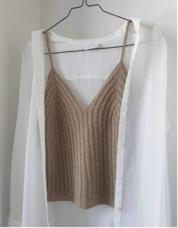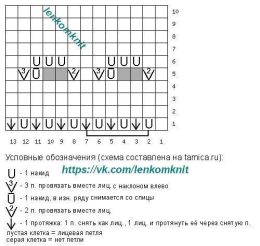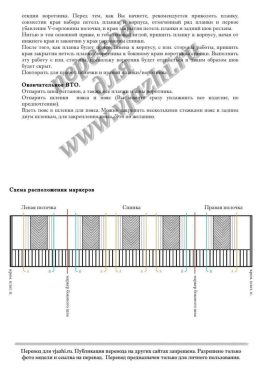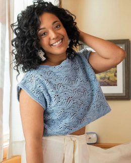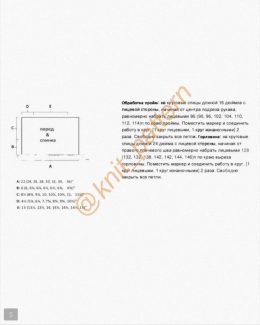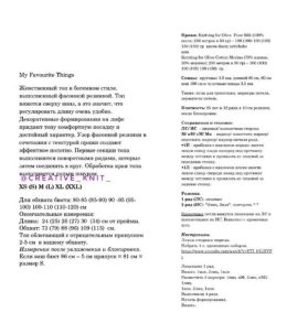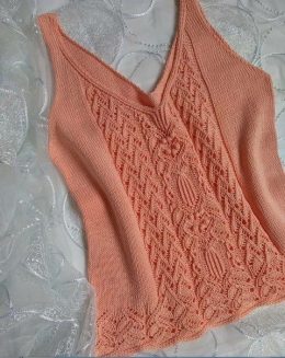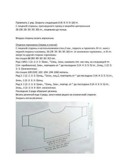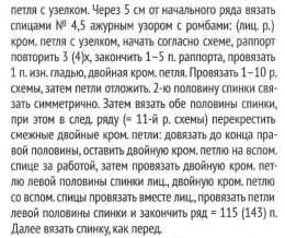 Спицами выполнен топ с изящным ажурным узором, который украшает центральную часть изделия. Особенность модели — сочетание плотного гладкого полотна с декоративн...