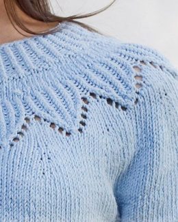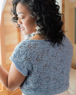 Эта короткая кофта выполнена из мягкой пряжи нежно-голубого цвета с изящным ажурным узором по линии горловины, создающим эффект лепестков. Рукава средней длины...