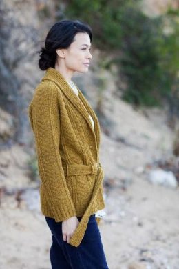 Этот кардиган выполнен спицами из объемной шерстяной пряжи горчичного цвета. Особенностью модели является крупная текстурная вязка с узором косы, создающая эффе...