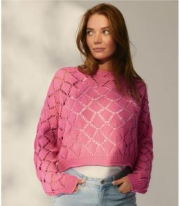 Этот яркий розовый свитер привлекает внимание своим уникальным ажурным рисунком в виде ромбов, который создает легкий и воздушный эффект. Модель выполнена из мя...