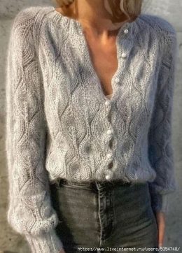 Элегантный кардиган из мягкой пряжи с выразительным узором косы, украшенный нежными жемчужными пуговицами, которые придают изделию утонченность и изысканный вид...