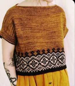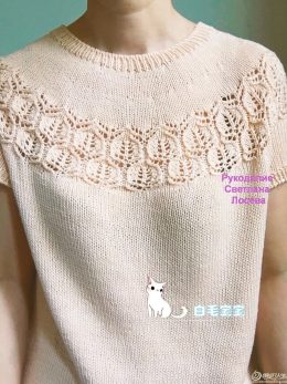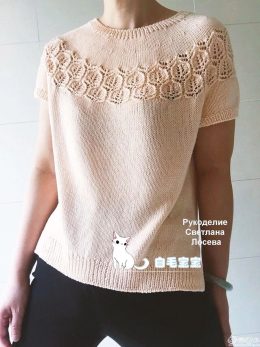 Этот удивительный вязаный свитер с короткими рукавами покоряет сердце своими изящными узорами и неповторимой текстурой. Яркий и легкий, он украшен сложными ажур...
