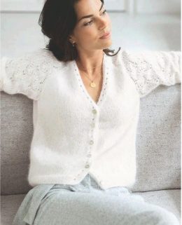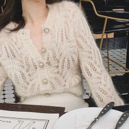 Эта изысканная вязаная кофта с ажурной кокеткой выполнена вручную и тончайшими нитями, дарит ощущение легкости и нежности. Великолепный узор с листьями на плеча...