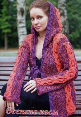 Кардиган с капюшоном вязать спицами Размер: 38/40 Вам потребуется: 250 г терракотовой (№ 2622), 100 г фиолетовой (№ 2941) пряжи Gioia 80, Bertagna Filati...