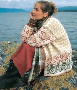 Изысканный вязаный жакет выполнен из мягкой пряжи с цветочным жаккардовым узором по кокетке и нижнему краю. Особенность модели — контрастная синяя отделка по пл...