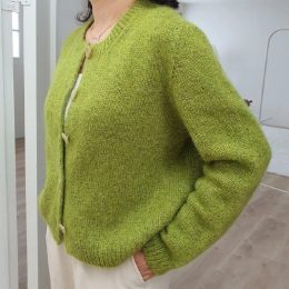 Мягкий и теплый кардиган выполнен спицами из нежного мохера с аккуратной резинкой по краям и оригинальными деревянными пуговицами, которые придают изделию особы...