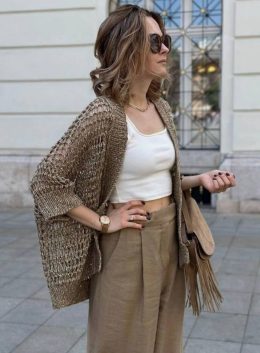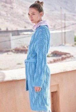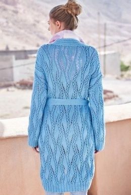 Этот голубой кардиган с ажурным узором и поясом напоминает о тех временах. Он идеально подходит для прохладных вечеров, добавляя нотку нежности и элегантности....
