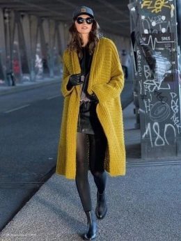 Потрясающий кардиган горчичного цвета привлекает внимание своим объемным вязанием и уютным фасоном. Длинные рукава и свободный крой создают комфорт и элегантнос...