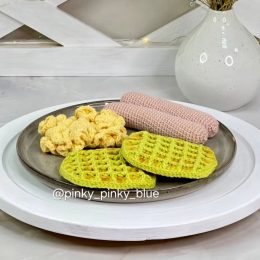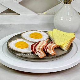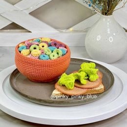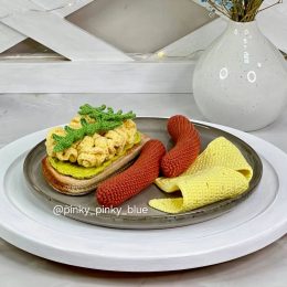 Иногда искусство — это создание еды, которую нельзя съесть. Вязаная композиция включает в себя миску с разноцветными пирожными и тост с листьями салата. Креативное использование пряжи придаёт изделию эффектный вид и вызывает улыбку.