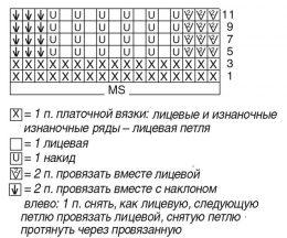 Вязать по приведенной схеме. На ней даны только лицевые ряды. В изнаночных рядах петли и накиды провязывать изнаночными.