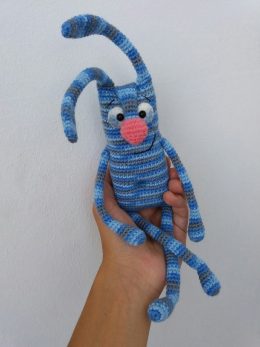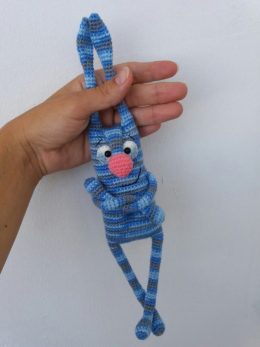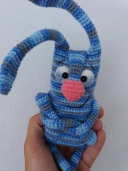 Представляем вам уникальную и очаровательную вязаную игрушку ручной работы. Каждый стежок этой голубой полосатой фигуры выполнен с любовью и вниманием к деталям, создавая образ милого длинноухого существа с выразительными глазами и ярким розовым носиком. Эта игрушка станет прекрасным дополнением интерьера или подарком, который согреет сердце своим теплом и заботой рук мастера.