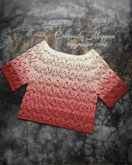 Нежный топ, связанный крючком из множества квадратных мотивов с ажурным цветочным узором. Легкая, дышащая структура и ровные швы делают изделие комфортным и сти...