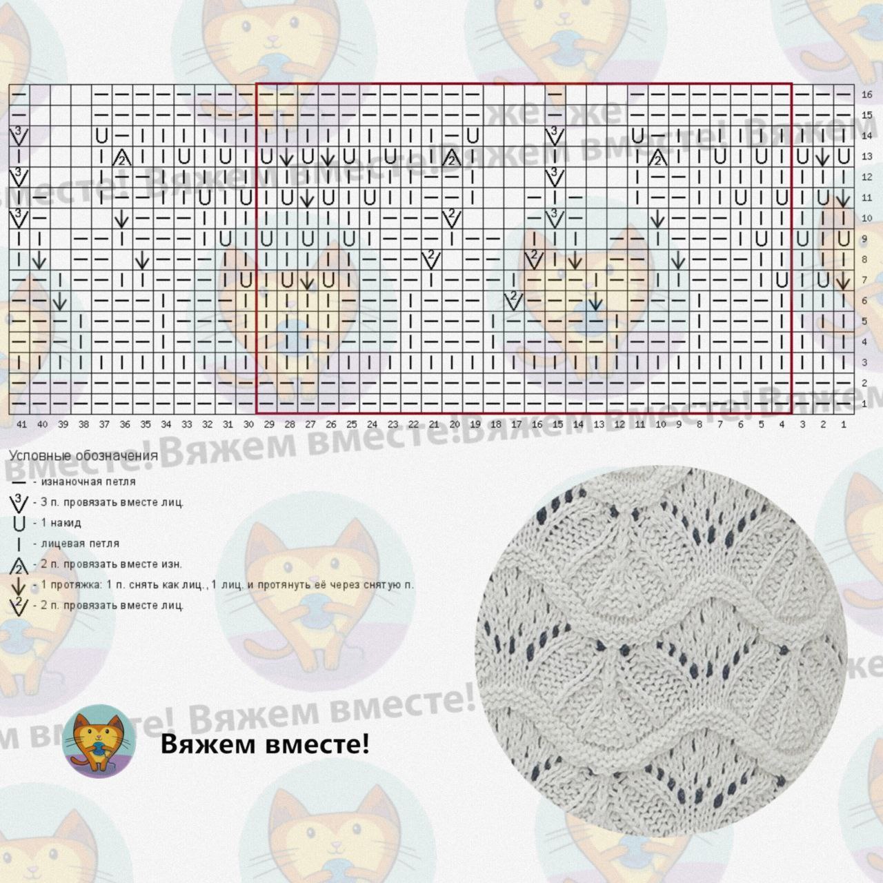 Раппорт узора равен 26 петлям по ширине и 16 рядам по высоте (последний ряд узора в оригинале не вяжется, а выполняются лишь три ряда изнаночных петель). Обратите внимание, что на схеме даны как нечётные, так и чётные ряды вязания, а петли обозначены так, как они лежат на лицевой стороне полотна.