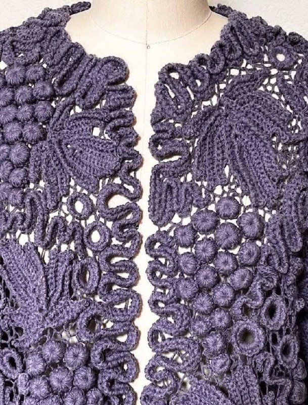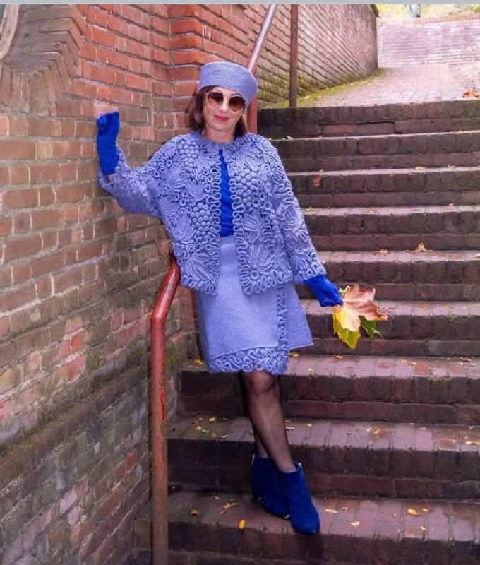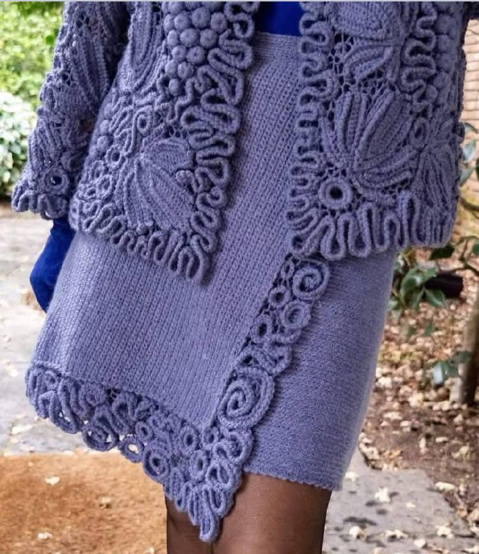 Элегантный женский костюм из теплого шерстяного материала с уникальной объемной вязкой и декоративными кружевными вставками, подчеркнутыми контрастными швами и модными карманами.
