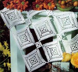 По завершении 8-го ряда 1-й квадрат готов. Связать 9 таких квадратов. По краям вывязать, как показано, соединительные полоски: с соответствующих углов, начав с 1 ст. б/н, связать цепочку из 9 возд. п., 1 ст. б/н провязать в пико напротив, 1 возд. п. с поворотом, 1 ст. б/н в 1 возд. п. 1-го ряда, *1 возд. п., 1 пико, 1 ст. б/н в петлю, расположенную через одну, от * повторить 2 р., 2 возд. п., 1 пико, 1 ст. б/н в цепочку из возд. п. квадрата.