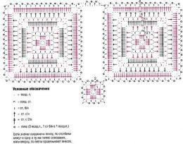 Продолжить вязание по схеме. Связать, как показано, 4 маленьких квадрата, выполнив 2 рада по схеме для больших квадратов. На схеме приведена часть мотива, который необходимо продолжить по смыслу. Цифрами обозначена нумерация рядов.