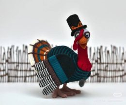 Вы знаете, говорят, что индейки на День Благодарения предпочитают стиль ретро. Посмотрите на эту очаровательную вязаную индейку в цилиндре — она выглядит как настоящий модник! Особенно впечатляют её шикарные полосатые хвостовые перья и яркий галстук-бабочка.