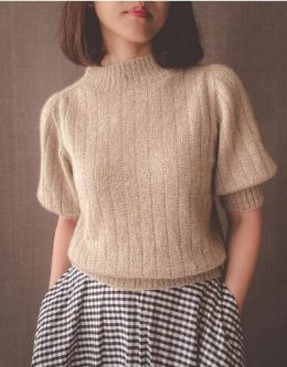 Уютный джемпер с короткими рукавами и оригинальным узором из мелких треугольников, создающих ритмичные горизонтальные полосы. Модель выполнена спицами из мягкой...