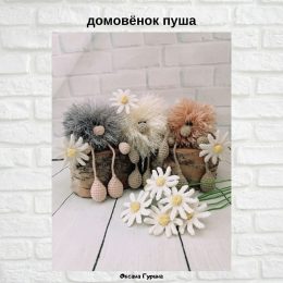 Дорогой друг, взгляни на этих чудесных домовят! Эти пушистые создания сидят в горшочках, окруженные вязанными ромашками. Их забавные длинные ноги и милые ушки д...