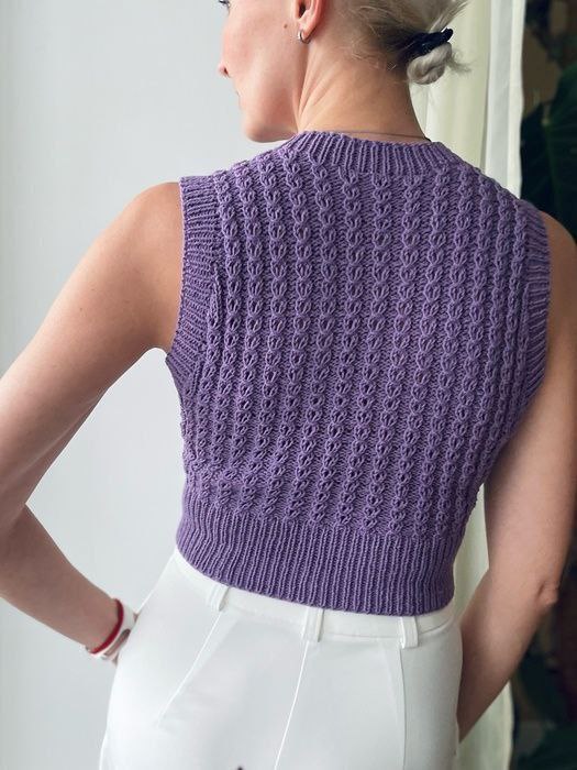 Стильный топ без рукавов, выполненный из мягкой пряжи с мелким ажурным узором, создающим объем и оригинальность изделия. Особое внимание уделено аккуратной резинке по низу и вырезу, которые подчеркивают силуэт и обеспечивают комфортную посадку.