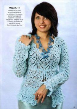 Общая нижняя часть: соедините 16 квадратов и 8 простых половинок квадрата. Готовые детали сшейте и обвяжите 1 рядом ст.б/н. Края разреза обвяжите по переду узором по схеме 4, а горловину, низ изделия, низ рукавов узором по схеме 5. Свяжите шнур-гусеничку длиной 130 см и продерните его в месте соединения кокеток и общей нижней части изделия.
